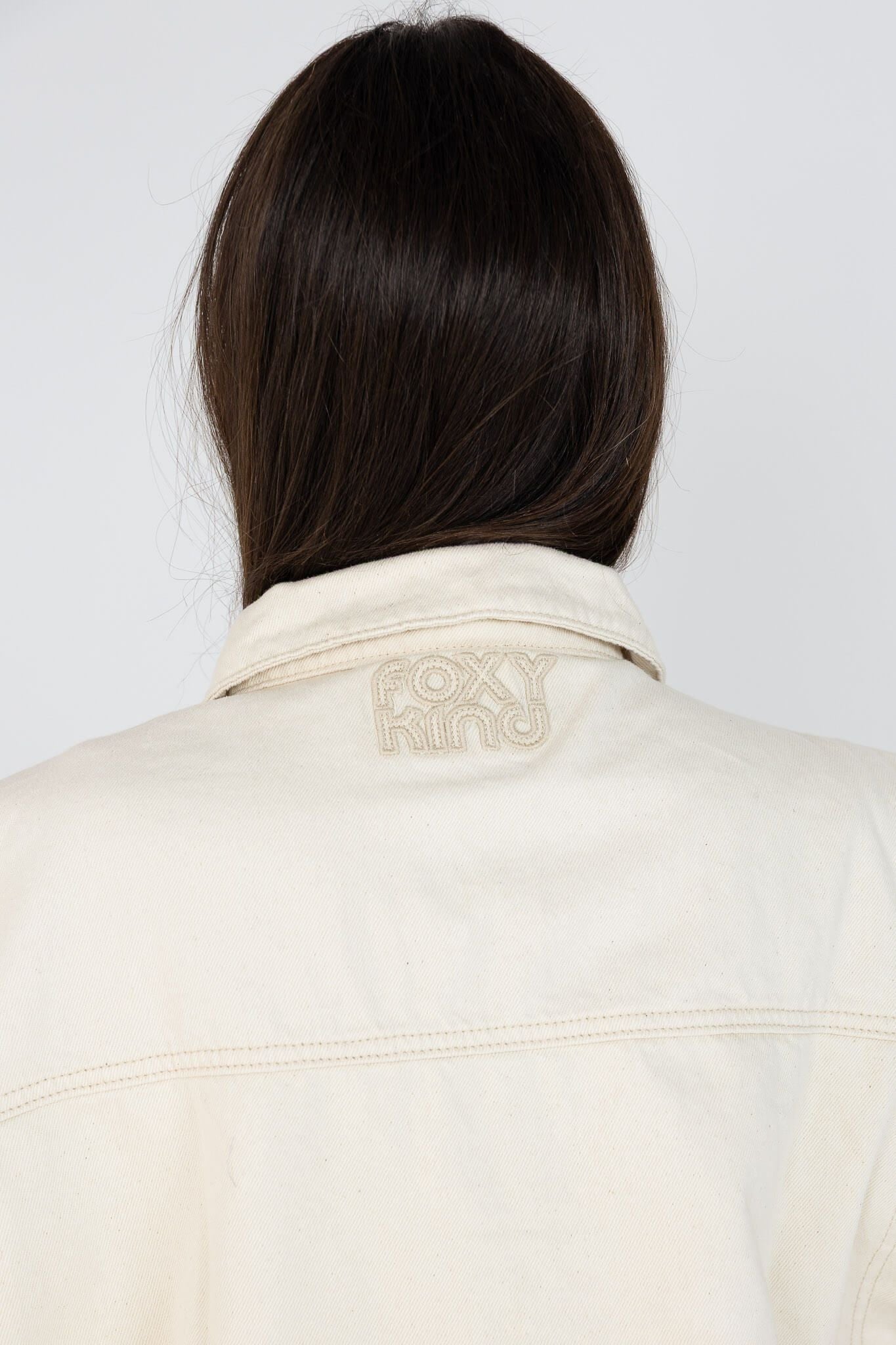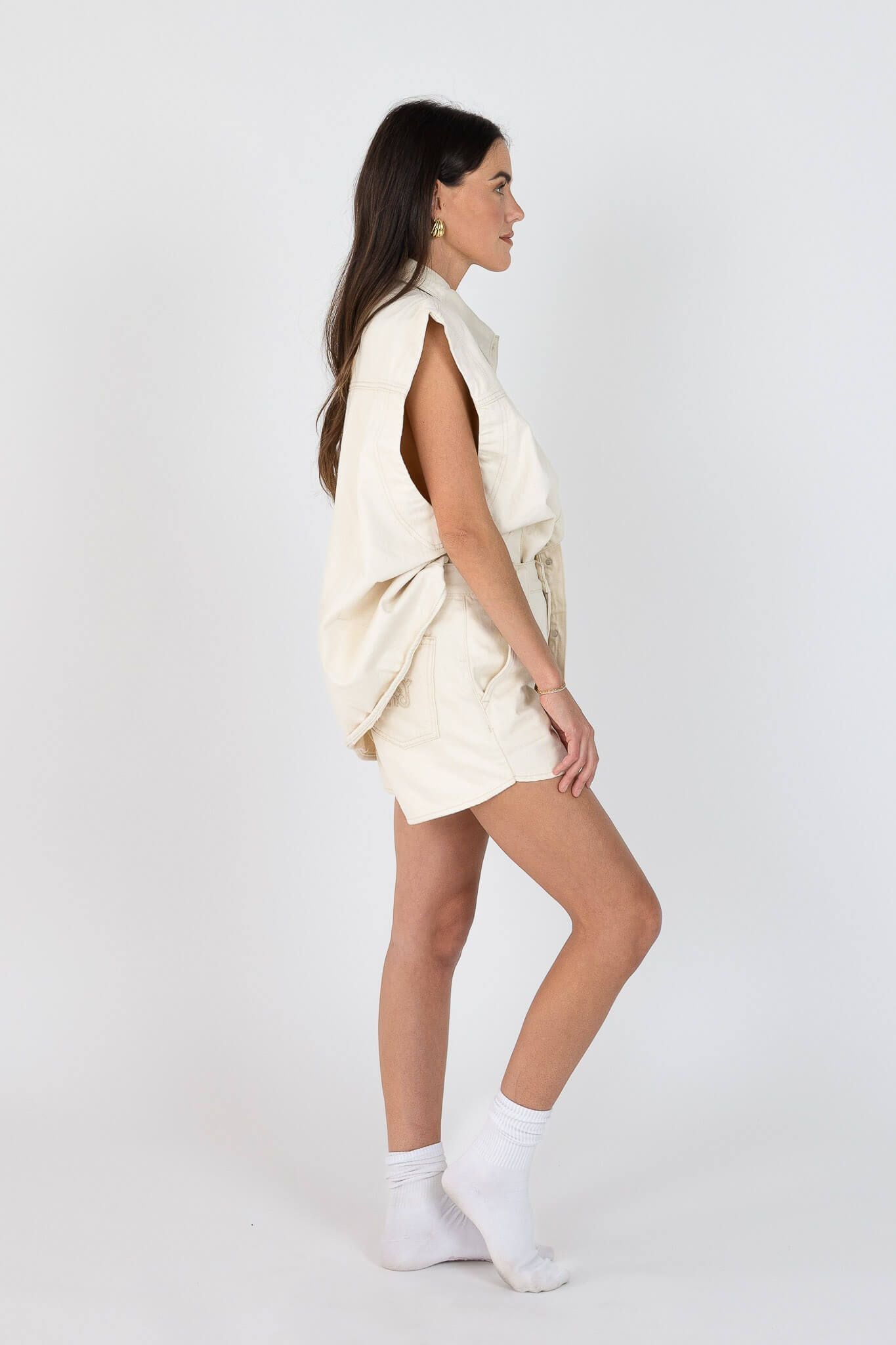 Meet the Ace High Denim Set in Buttermilk. This durable and soft denim carefully crafted in a flattering yet relaxed style is a closet staple. With custom Foxy Kind patches and buttons, this set is going to be your new go to! This set features an oversized vest and a pair of relaxed fitting high waisted shorts.