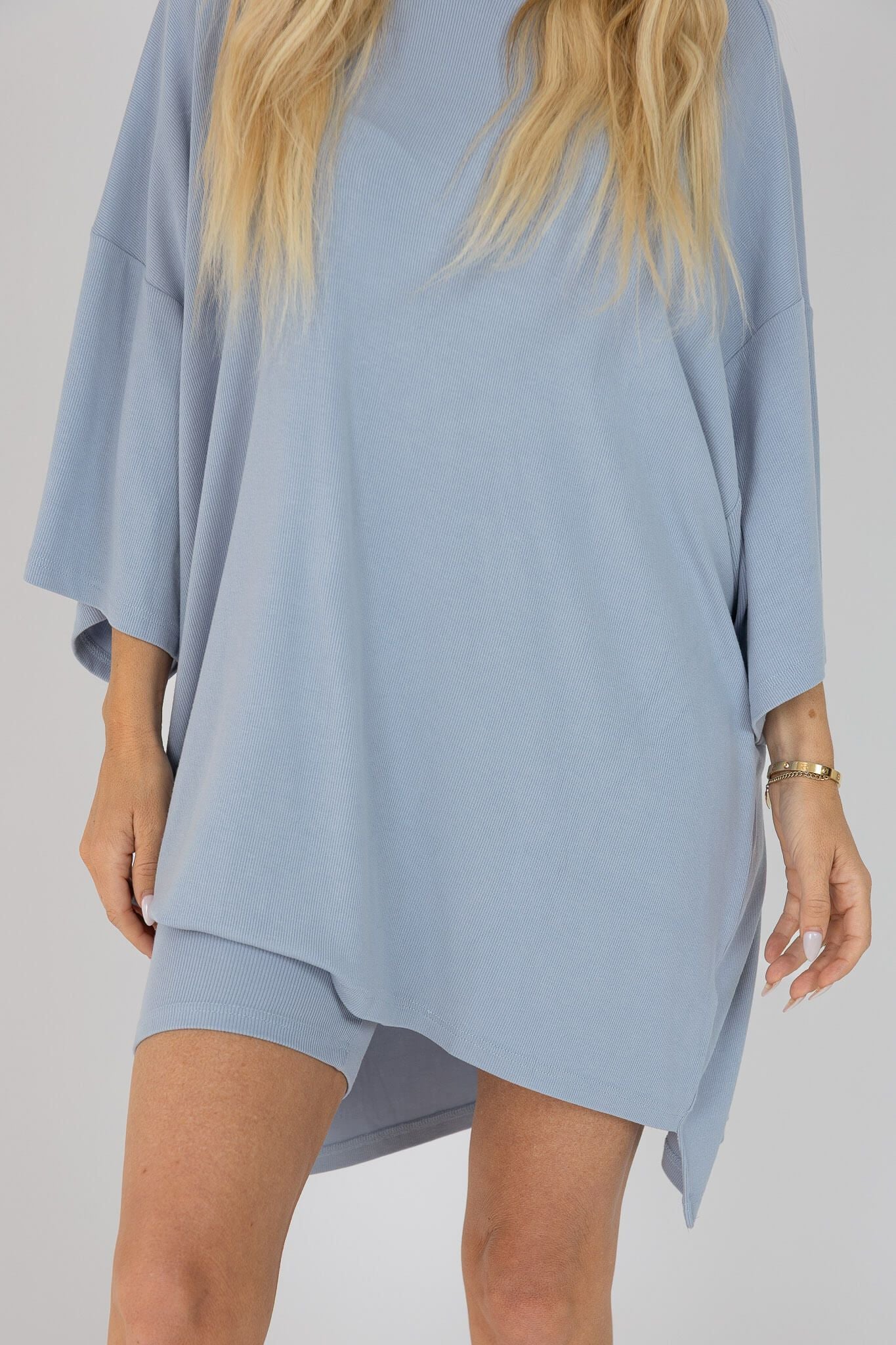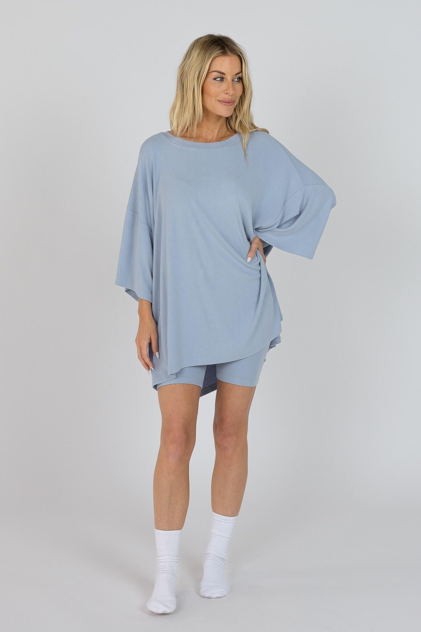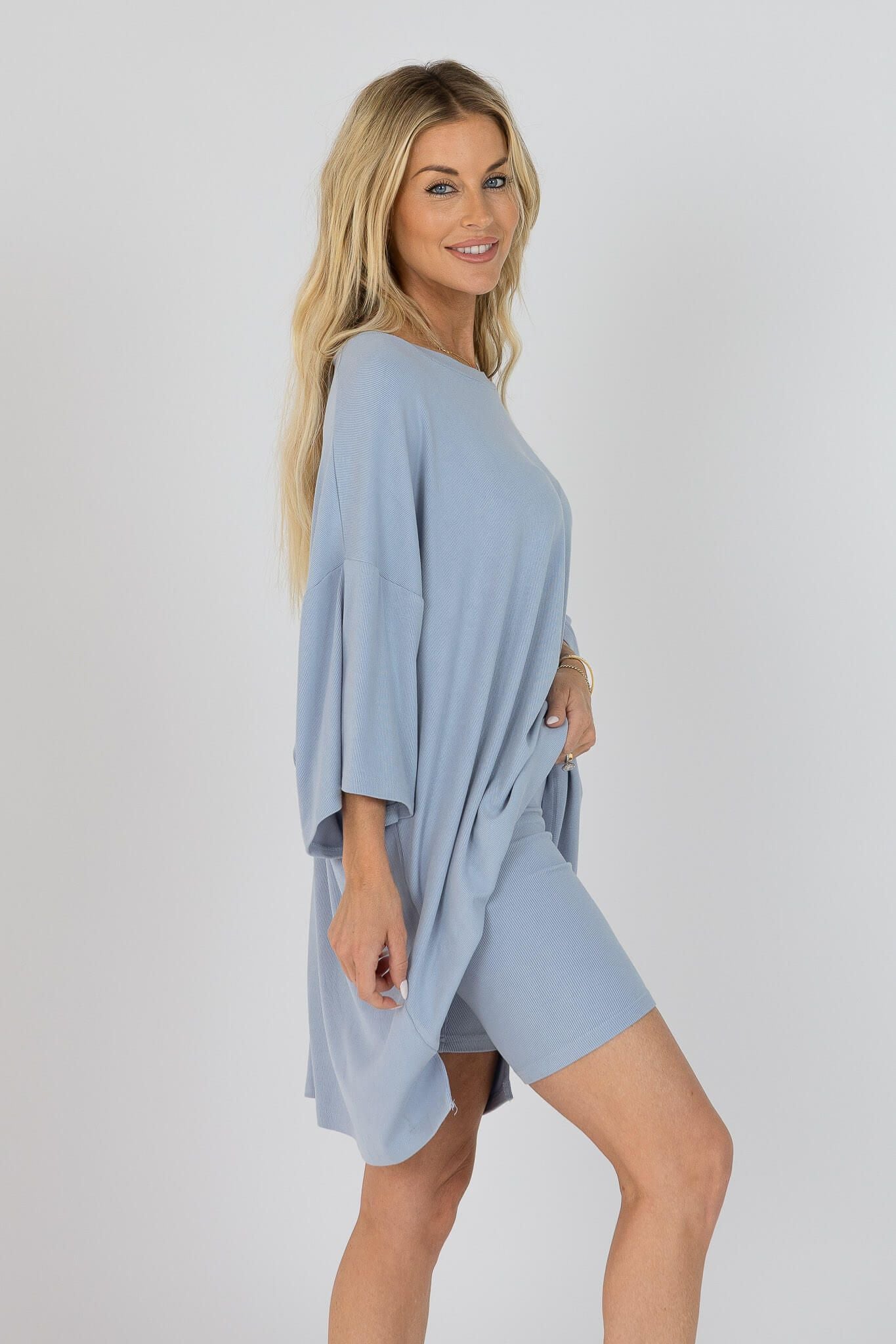 Your favorite set is back in a new duo of Spring colors! You will be dressing this up for every occasion and dressing it down to wear around the house. This set was made for EVERYBODY. This oversized boyfriend tee comes with a pair of matching biker shorts. The material is soft, very stretchy and ribbed. The best part about these biker shorts is they do not cut into your waist, they lay flat. They are tight enough to hold you in, but loose enough to feel relaxed and comfortable. The relaxed fit of this outfit has made it a 10/10.