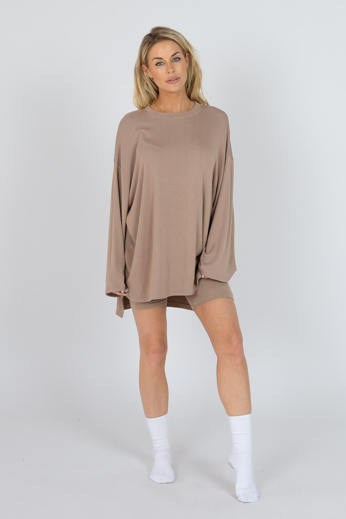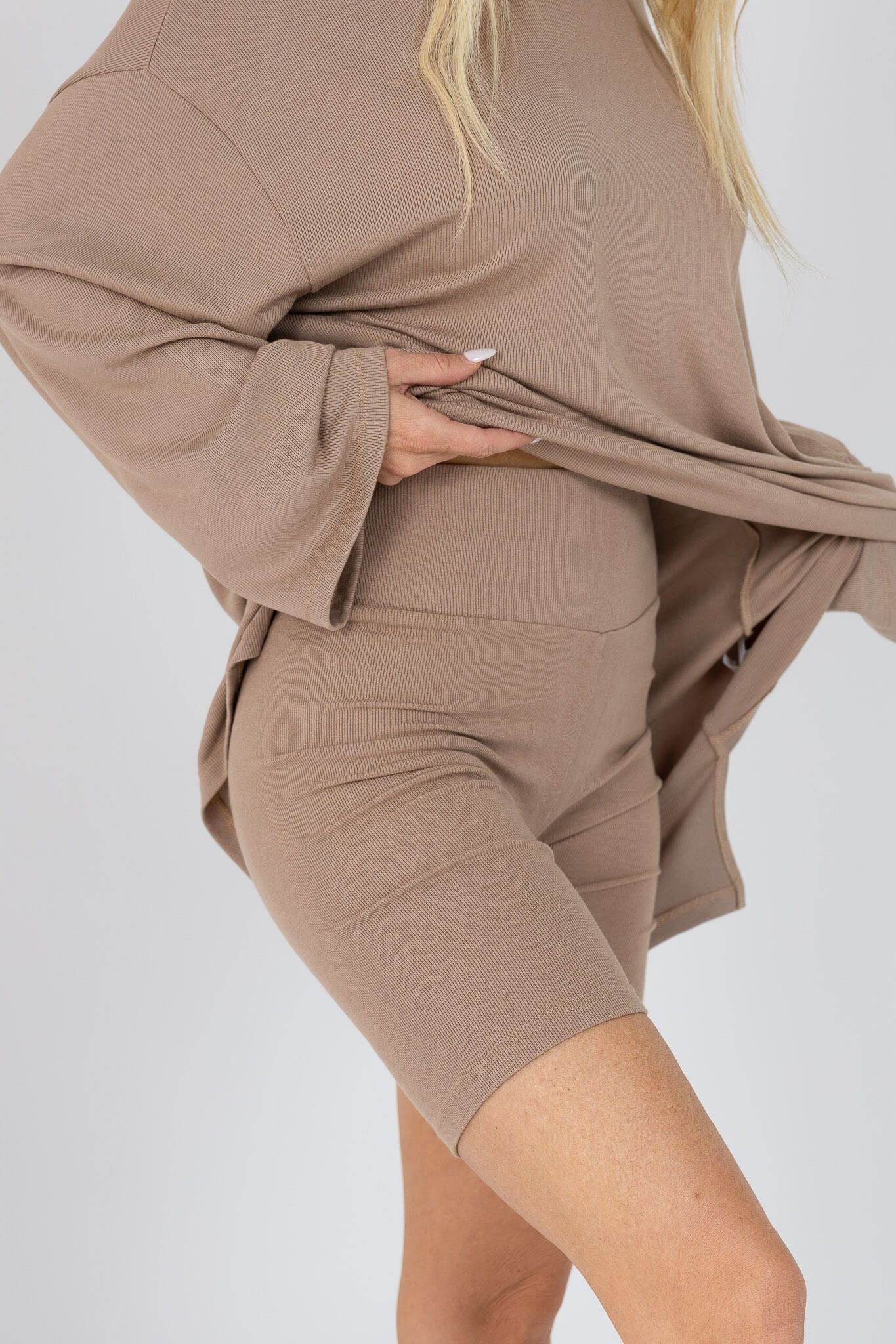 Your favorite set is back in a new fit! The All Weekend Long Set Long Sleeve is the same material as our origional All Weekend Long Set we just added long sleeves to the top. This oversized boyfriend long sleeve comes with a pair of matching biker shorts. The material is soft, very stretchy and ribbed. The best part about these biker shorts is they do not cut into your waist, they lay flat. They are tight enough to hold you in, but loose enough to feel relaxed and comfortable. The relaxed fit of this outfit has made it a 10/10.
