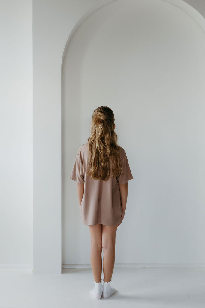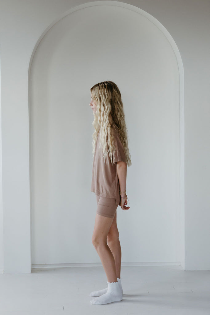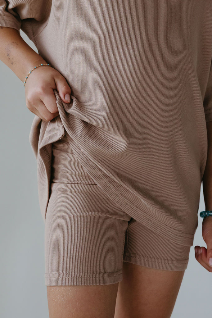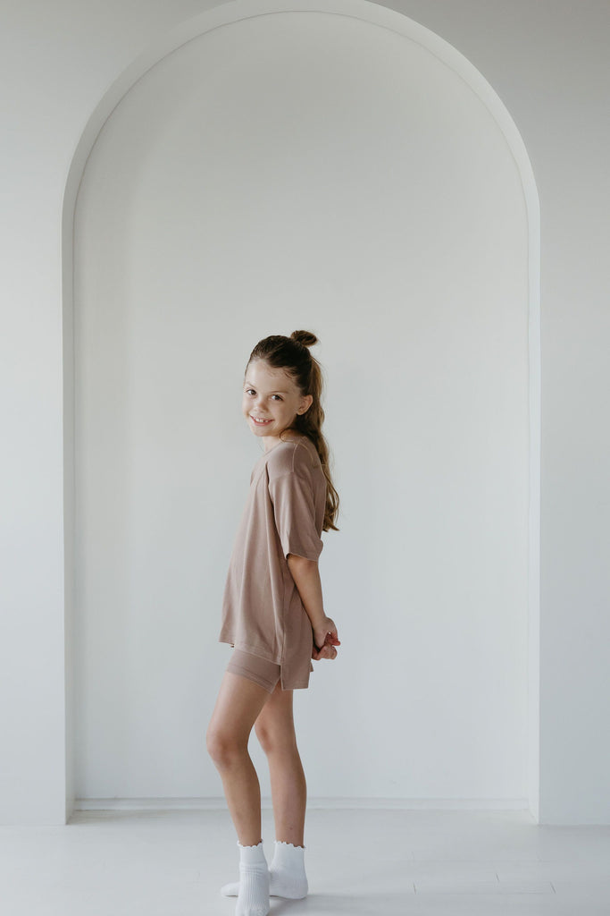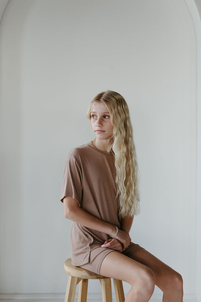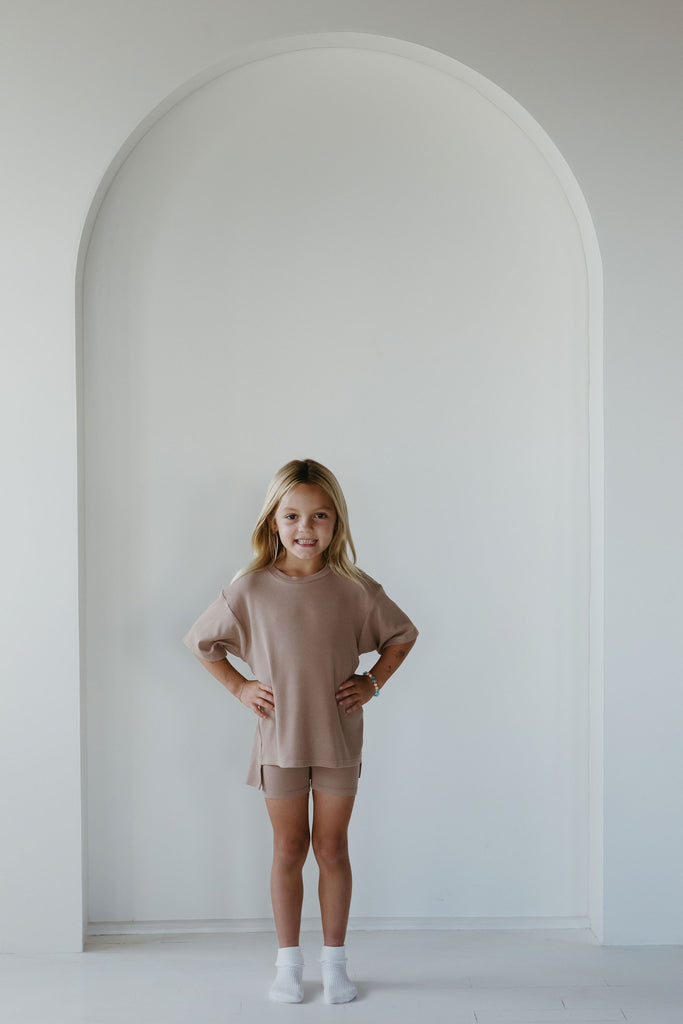 The set you have been loving is now available for your little one! The perfect play date, school, or mommy and me outfit. This oversized boyfriend tee comes with a pair of matching biker shorts. The material is soft, very stretchy and ribbed. The best part about these biker shorts is they do not cut into your waist, they lay flat. They are tight enough to hold you in, but loose enough to feel relaxed and comfortable. The relaxed fit of this outfit has made it a 10/10.