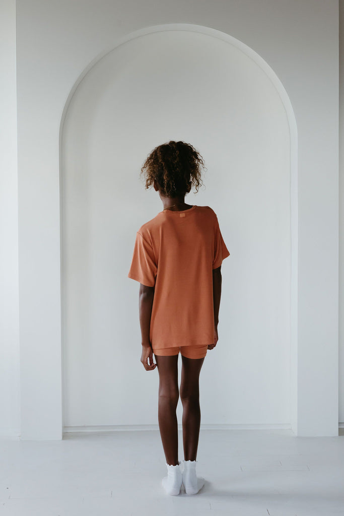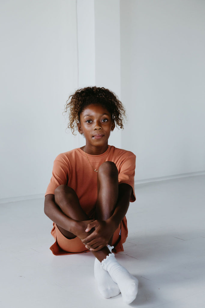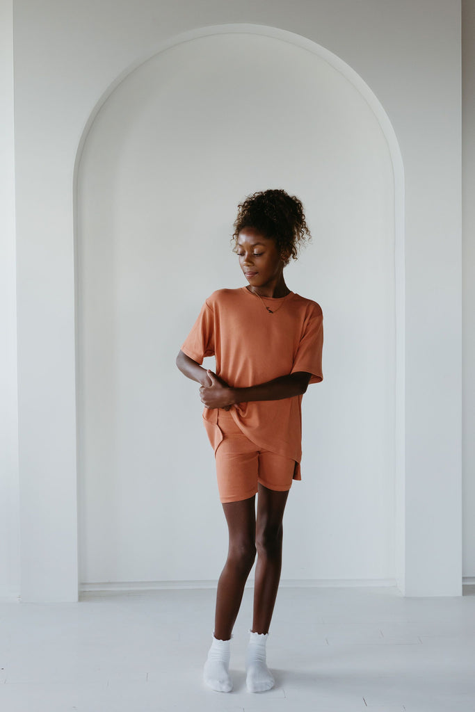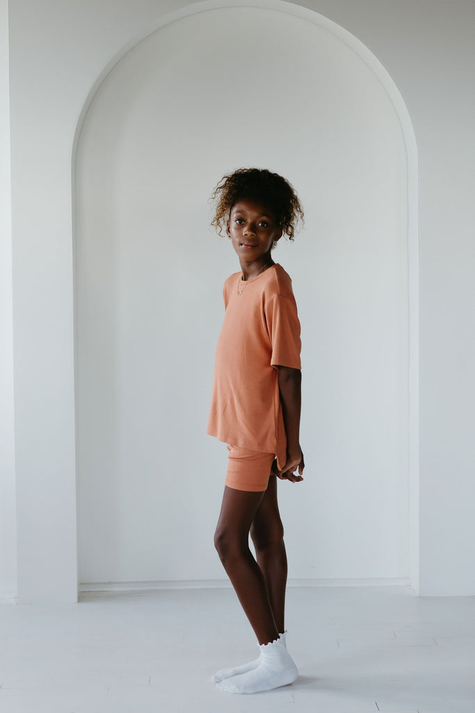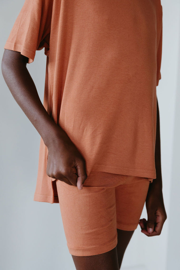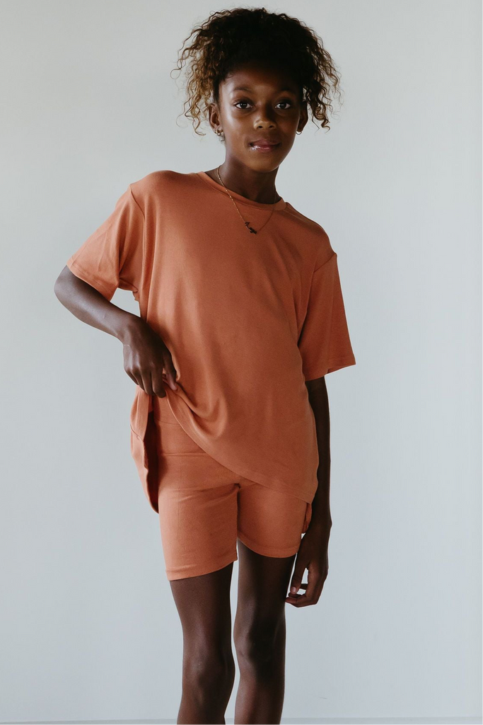 The set you have been loving is now available for your little one! The perfect play date, school, or mommy and me outfit. This oversized boyfriend tee comes with a pair of matching biker shorts. The material is soft, very stretchy and ribbed. The best part about these biker shorts is they do not cut into your waist, they lay flat. They are tight enough to hold you in, but loose enough to feel relaxed and comfortable. The relaxed fit of this outfit has made it a 10/10.