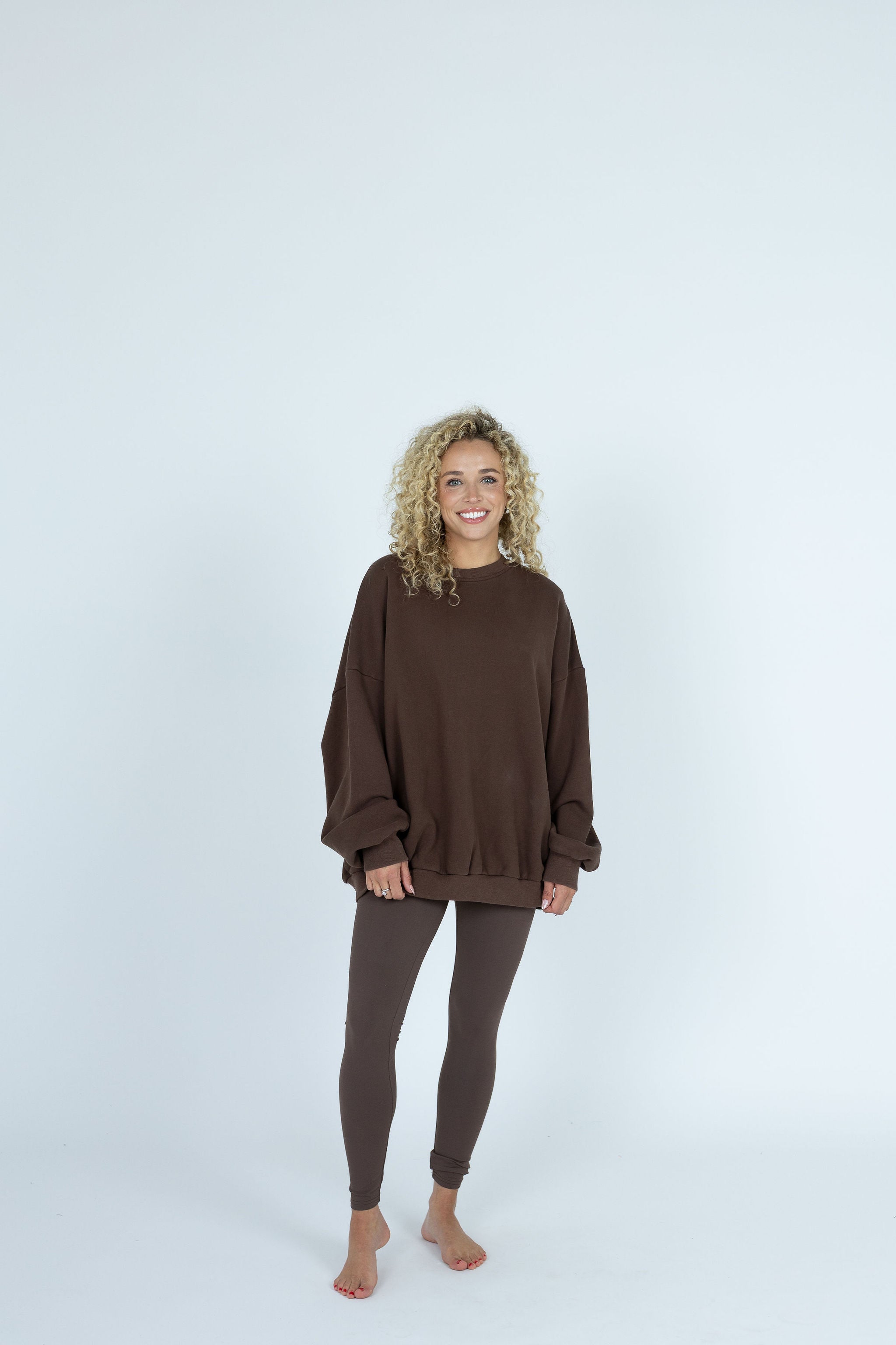 Our Coffee Run Set is the perfect set for your morning errands, work from home or evening at the movies. It features an oversized crew neck sweatshirt and high waisted leggings.