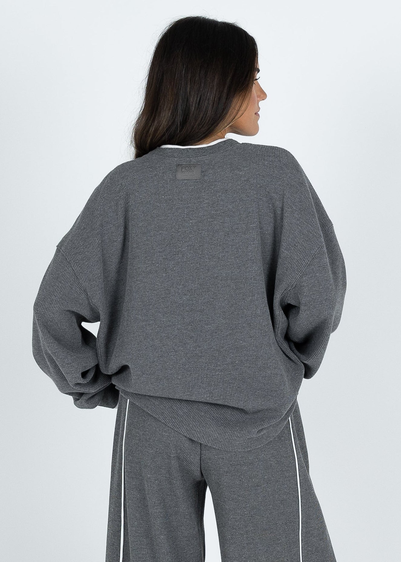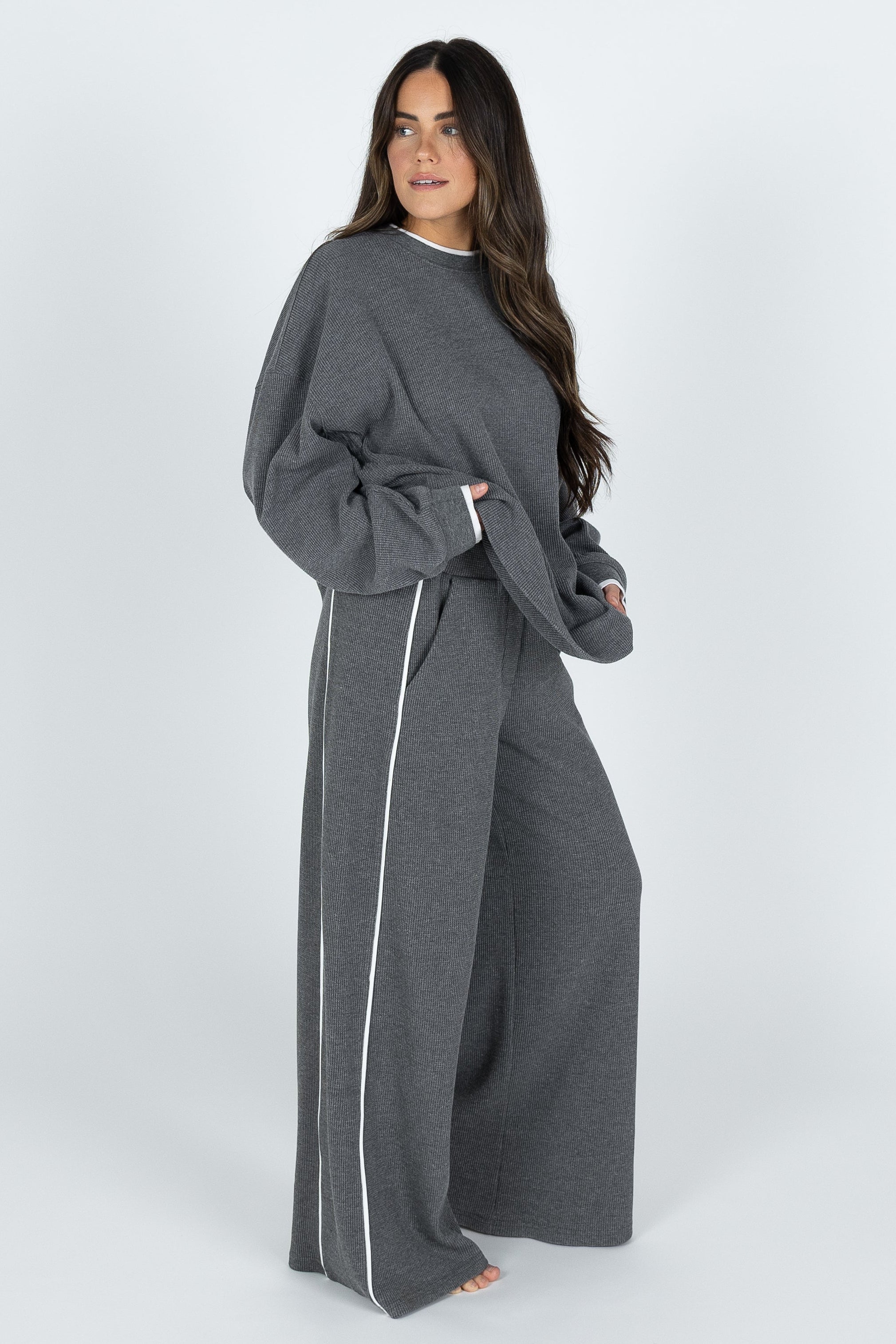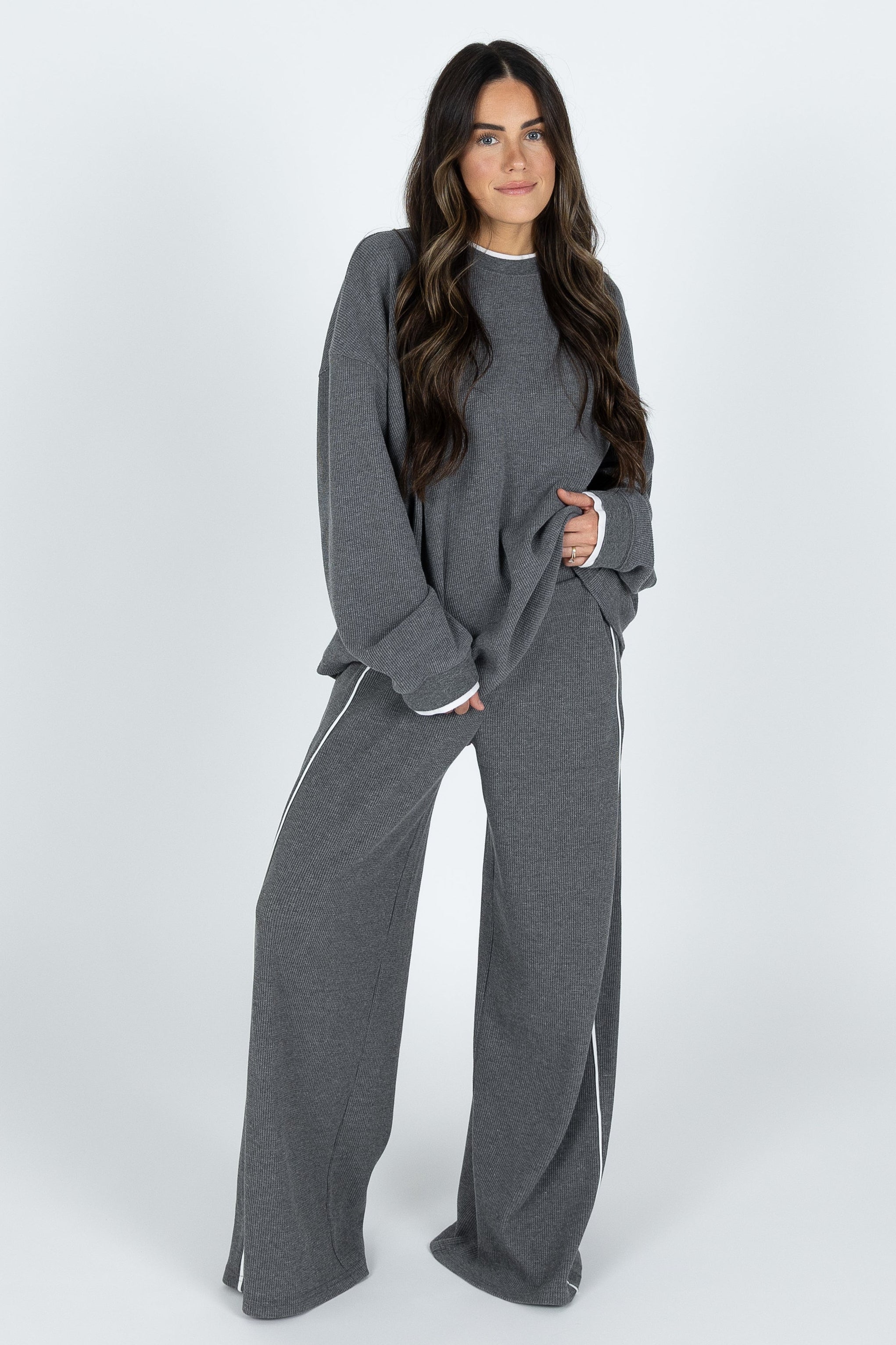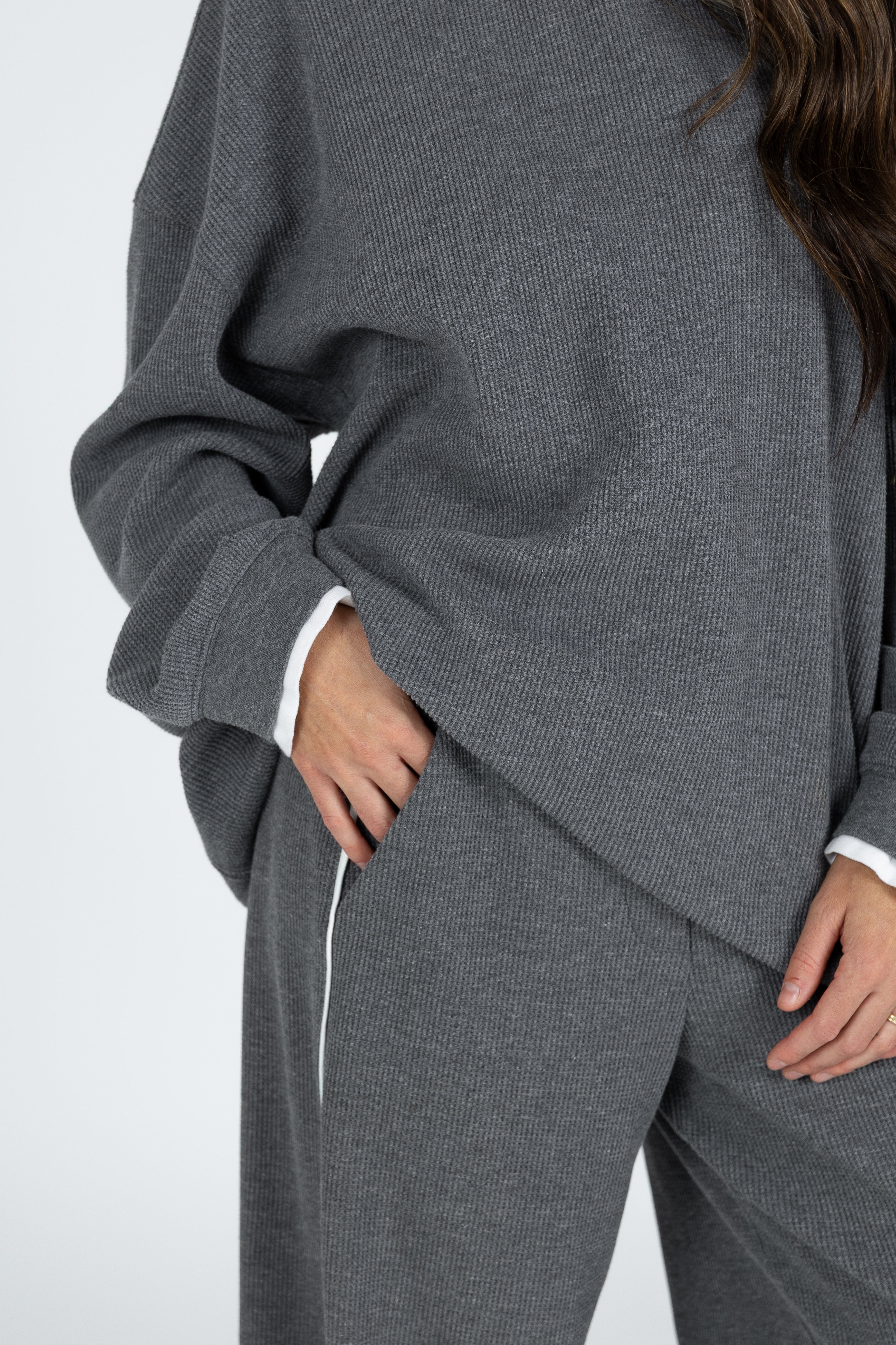 A brand new collection just hit the shelves. Meet the Off Duty Set. This soft and luxurious waffled fabric with elevated double later detail will be your new cool girl go to. Our relaxed and comfortable waistband is designed to hold you in without the squeeze, paired with a straight leg pant is the most flattering and comfortable fit. The oversized boyfriend long sleeve tee will be a versatile closet staple.